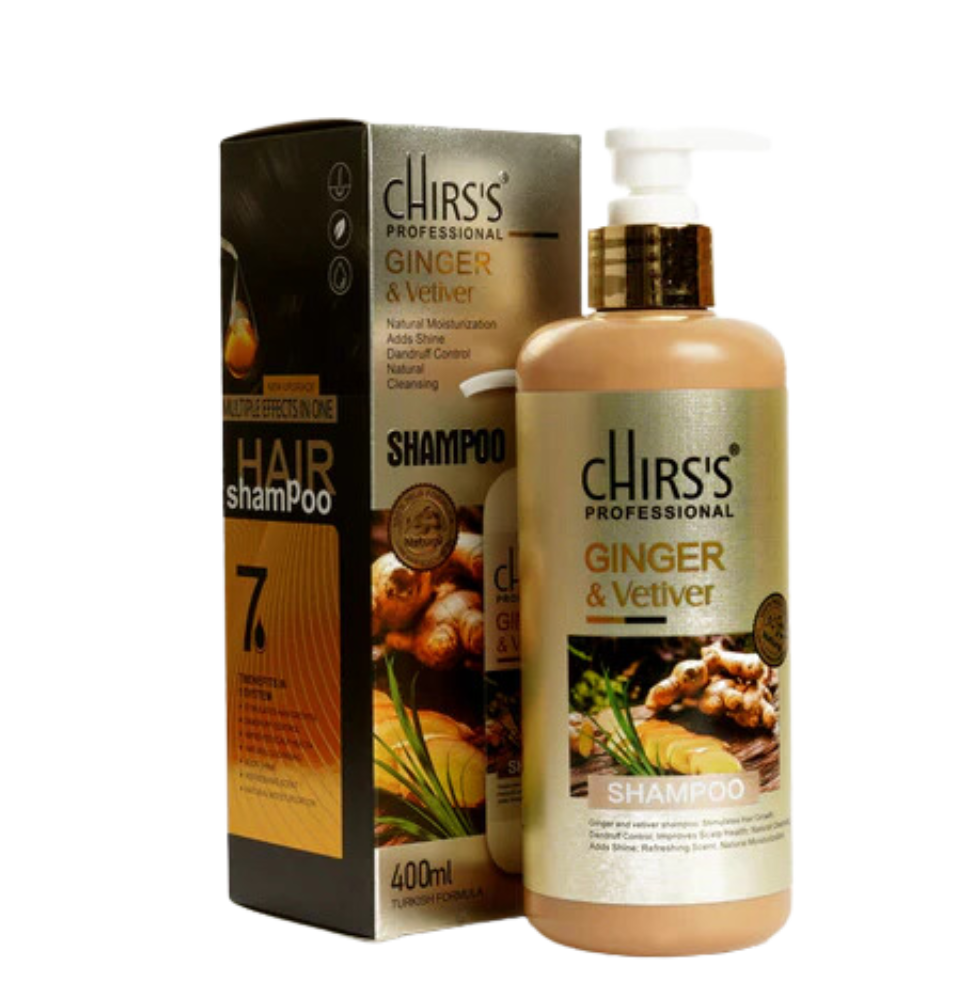 Chris's Professional Ginger & Vetiver Shampoo is a premium hair care product infused with the natural benefits of ginger and vetiver. Ginger is known for its invigorating and stimulating properties, promoting scalp health and aiding in hair growth. Vetiver, with its earthy scent, provides a soothing and calming effect, helping to balance the scalp. This shampoo is designed to cleanse and refresh the hair while adding vitality and shine. It's suitable for various hair types and aims to boost hair strength and manageability while providing a pleasant aromatic experience