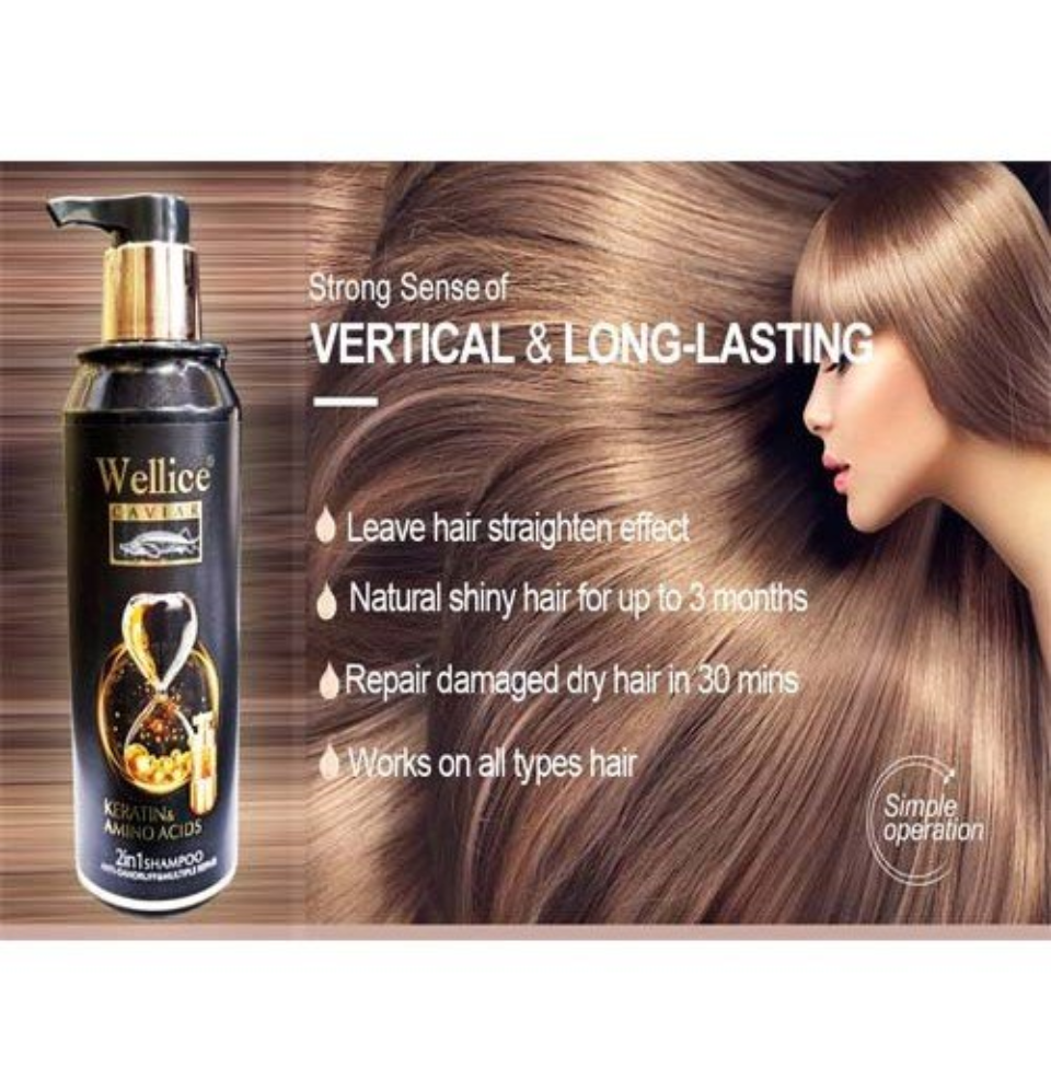 Introducing Wellice Caviar Keratin & Amino Acids 2in 1 shampoo caviar of selected deep sea sturgeon, also known as the deep sea, promotes collagen synthesis , improve hair quality, relieves dandruff and itching, balances water and oil, and multiple repairs.